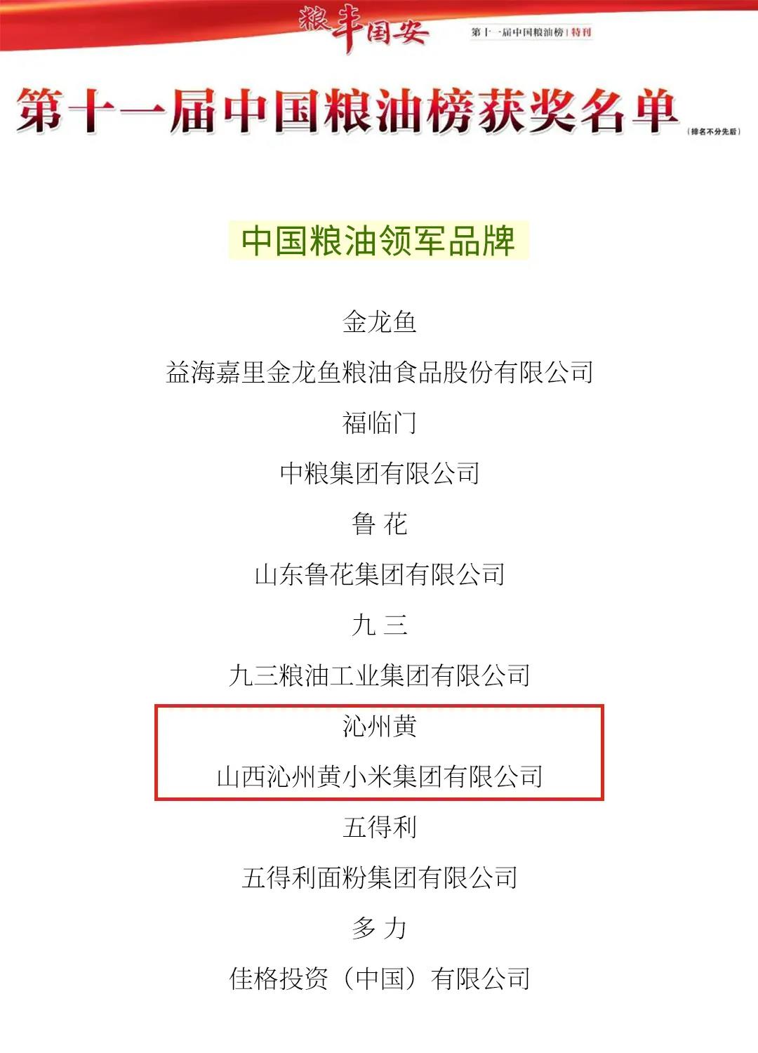 第十一屆中國糧油榜揭曉——沁州黃小米集榮獲“中國糧油領軍品牌”稱號!